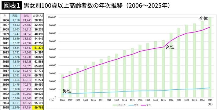 基に編集部作成(※100歳以上高齢者数は住民基本台帳による。海外在留邦人を除く。令和7年9月4日時点で都道府県・指定都市・中核市から報告があったものを集計)