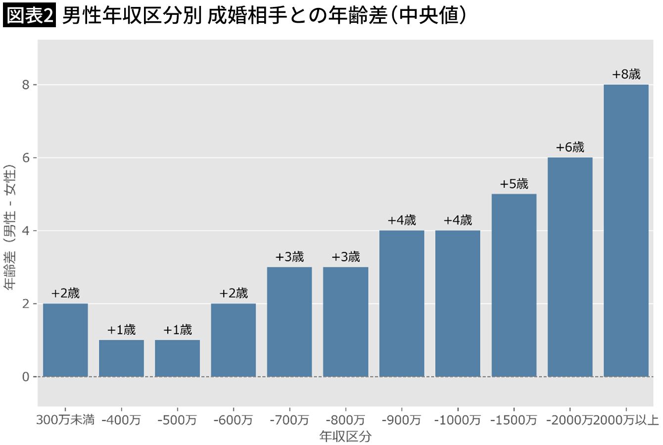 成婚相手の年齢差が4歳以上ある場合、男性側の年収の中央値は約1000万円以上ある(出所=IBJ「