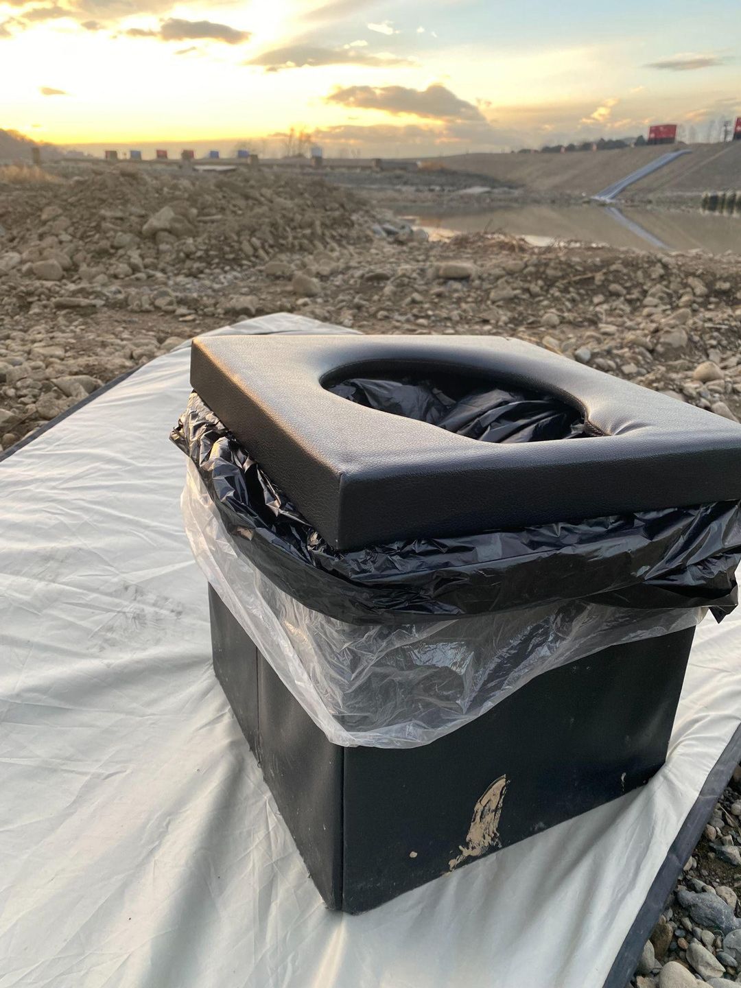 現場に行く際に持ち歩いている携帯トイレ。小さい箱のような形状で、中にはビニール袋が敷かれている
