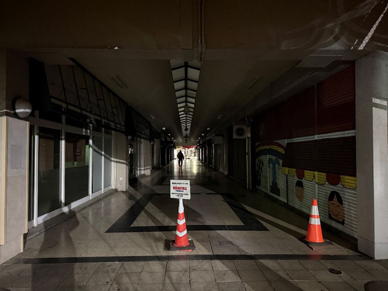 夜18時30分頃の藤が丘ショッピングセンターの様子。通路は灯りのないトンネルのようである