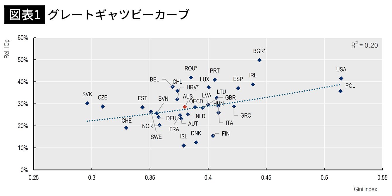 右上にいくほど格差が大きく、機会の不平等も大きい(出典=OECD「