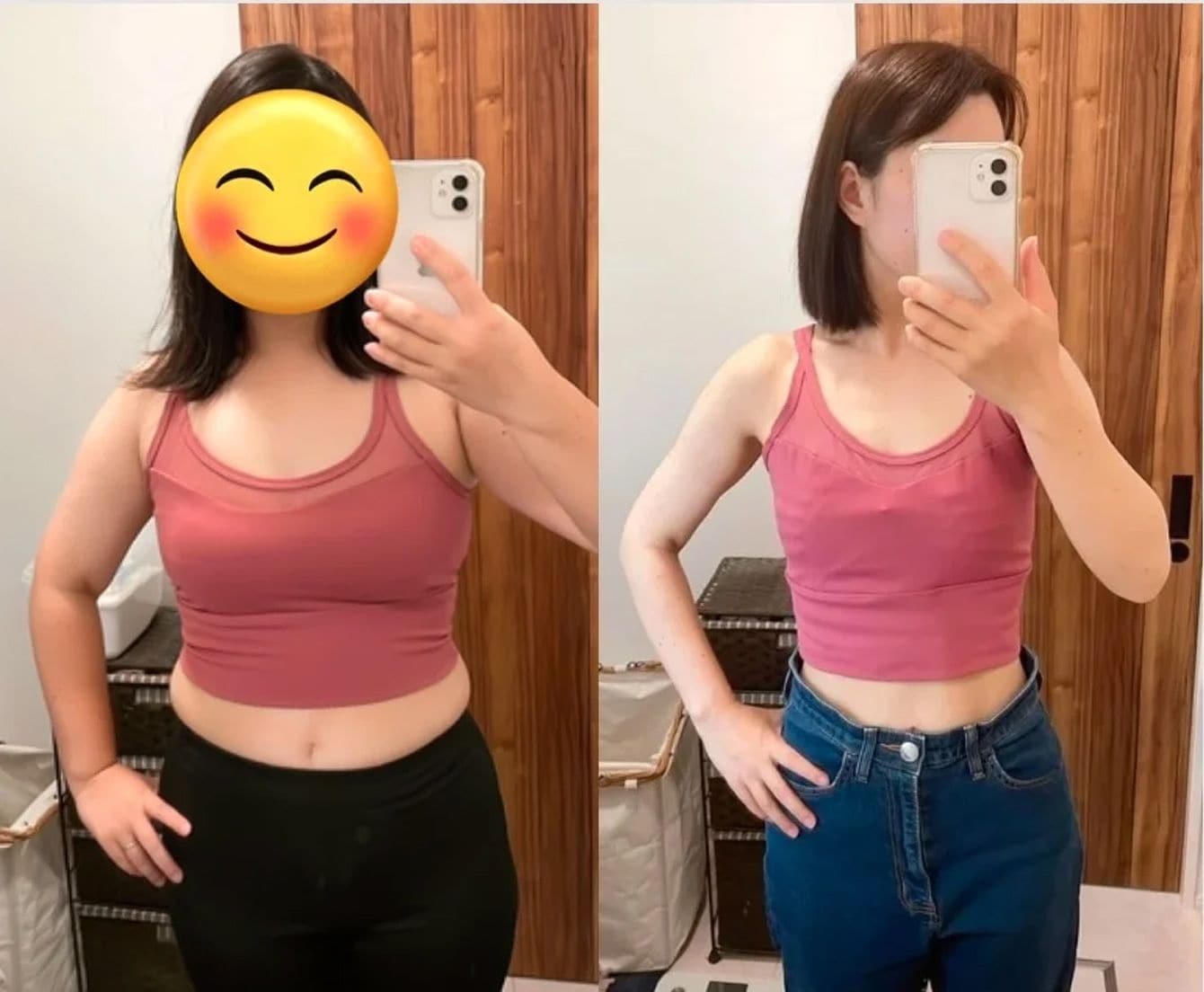 (左)やせて「胸やお尻が削げ落ちてしまった」という時期の写真 (右)筋トレをした現在の姿。ベンチプレスによりバストアップしたそう