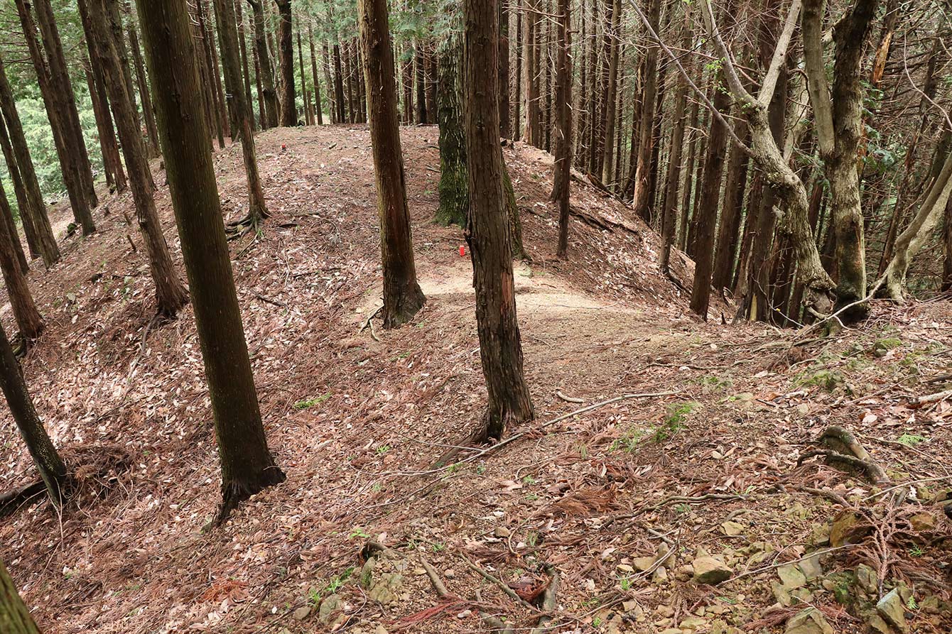 大堀切を城内側より。奥にもう一本堀切の凹みが見える