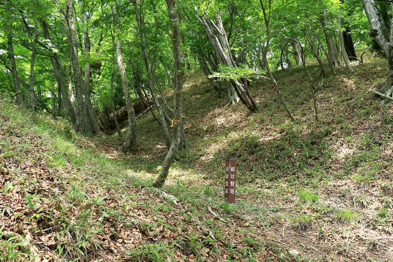 大堀切を城内側より。奥にもう一本堀切の凹みが見える