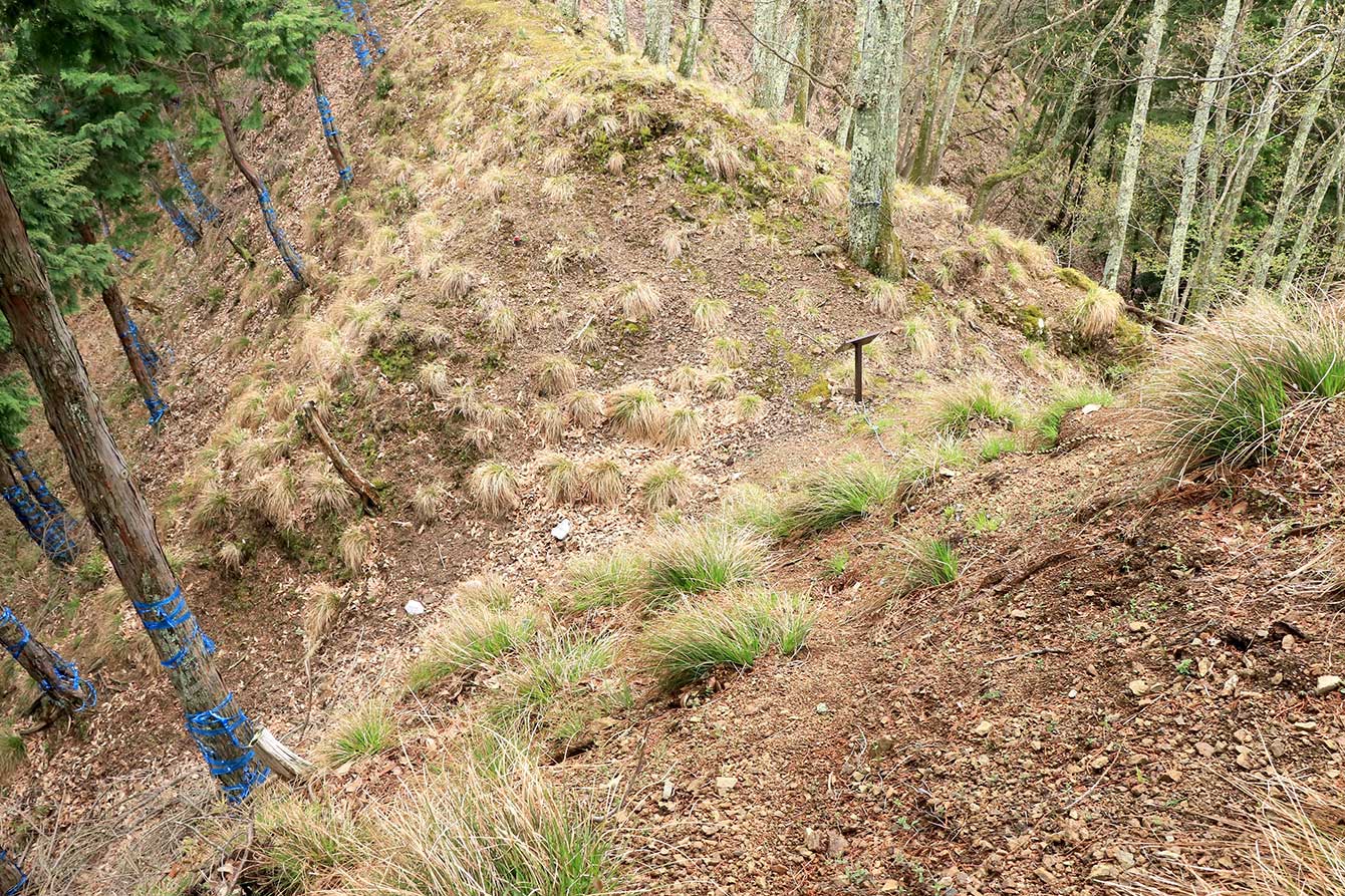 西尾根の堀切のひとつ。奥が崖になりさらにその下にも堀切
