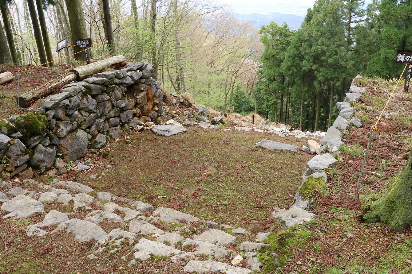 西尾根の堀切のひとつ。奥が崖になりさらにその下にも堀切