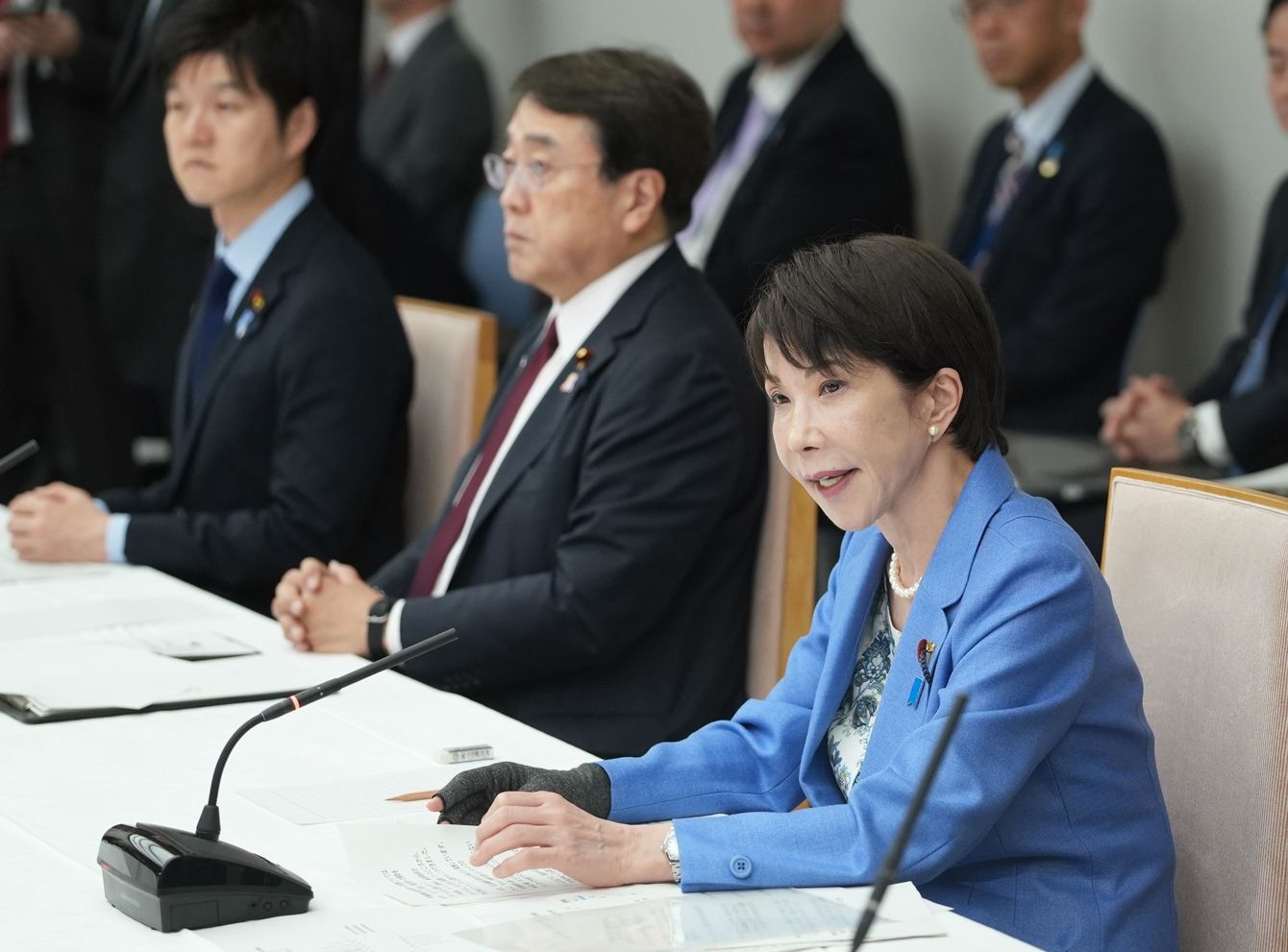 中東情勢に関する関係閣僚会議で発言する高市早苗首相(右)。中央は赤沢亮正経済産業相=2026年3月31日、首相官邸