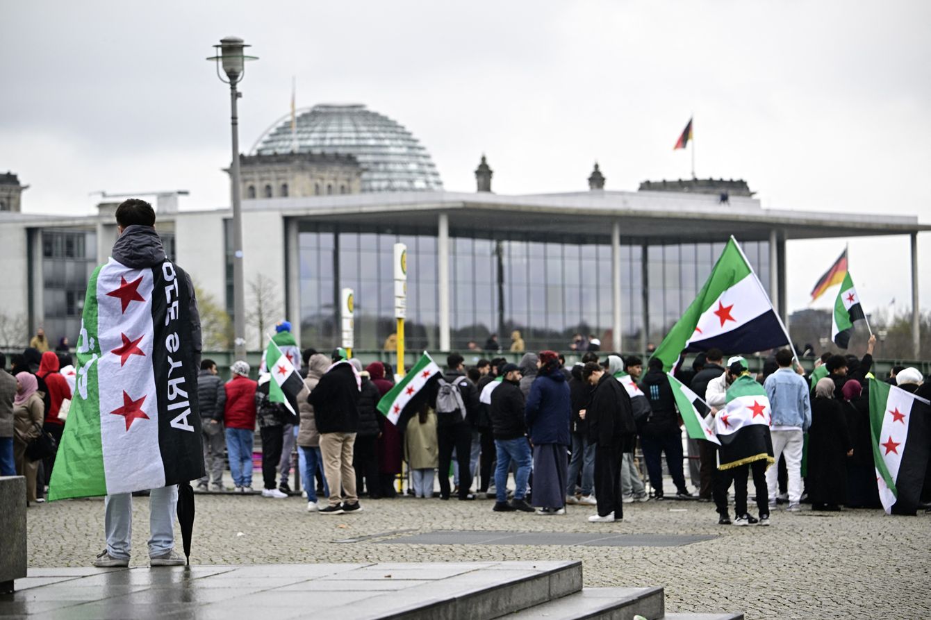独首相官邸の前で、シリアのシャラア暫定大統領を出迎える人たち(2026年3月30日、ベルリン)