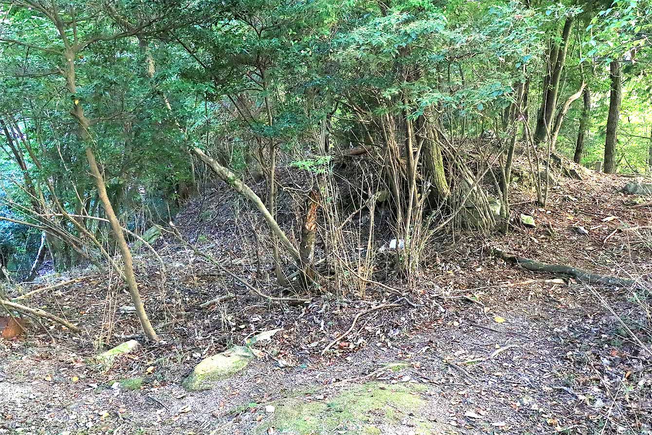 二の丸南端の切岸を城外より。転がる巨石はかつての石垣跡?