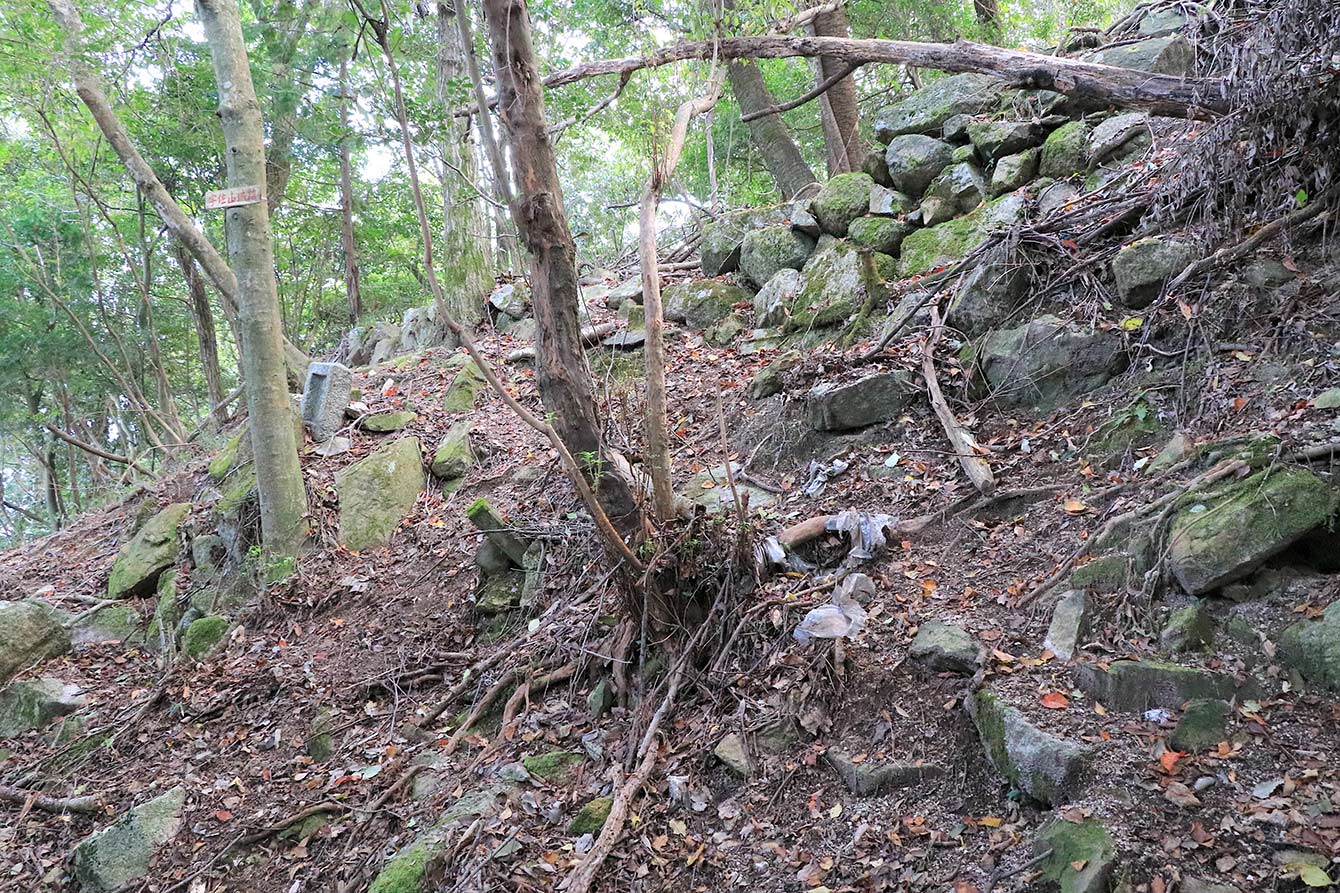 角部分にも石垣。その周辺の山肌は石垣がはがれ落ちた跡か