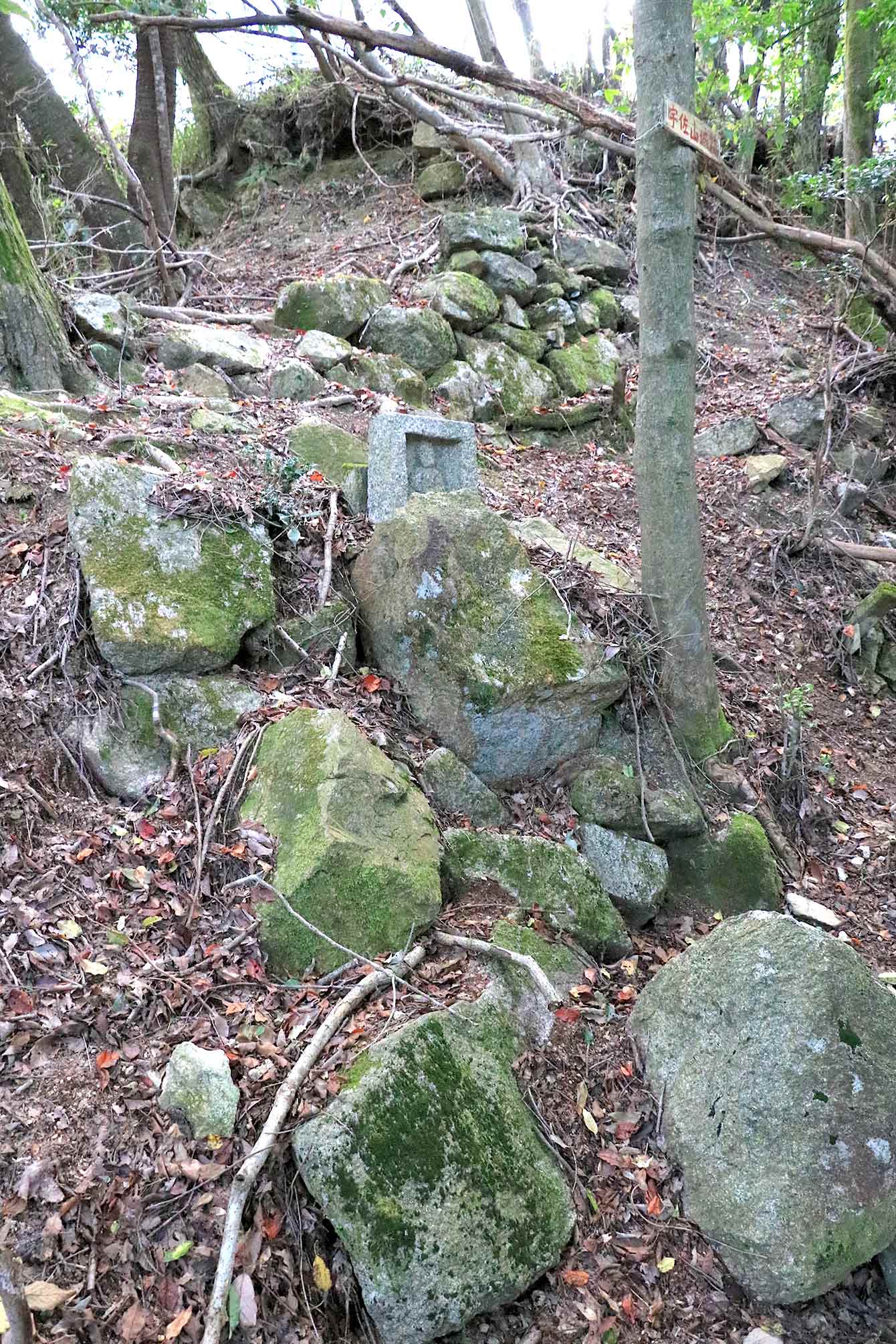 角部分にも石垣。その周辺の山肌は石垣がはがれ落ちた跡か