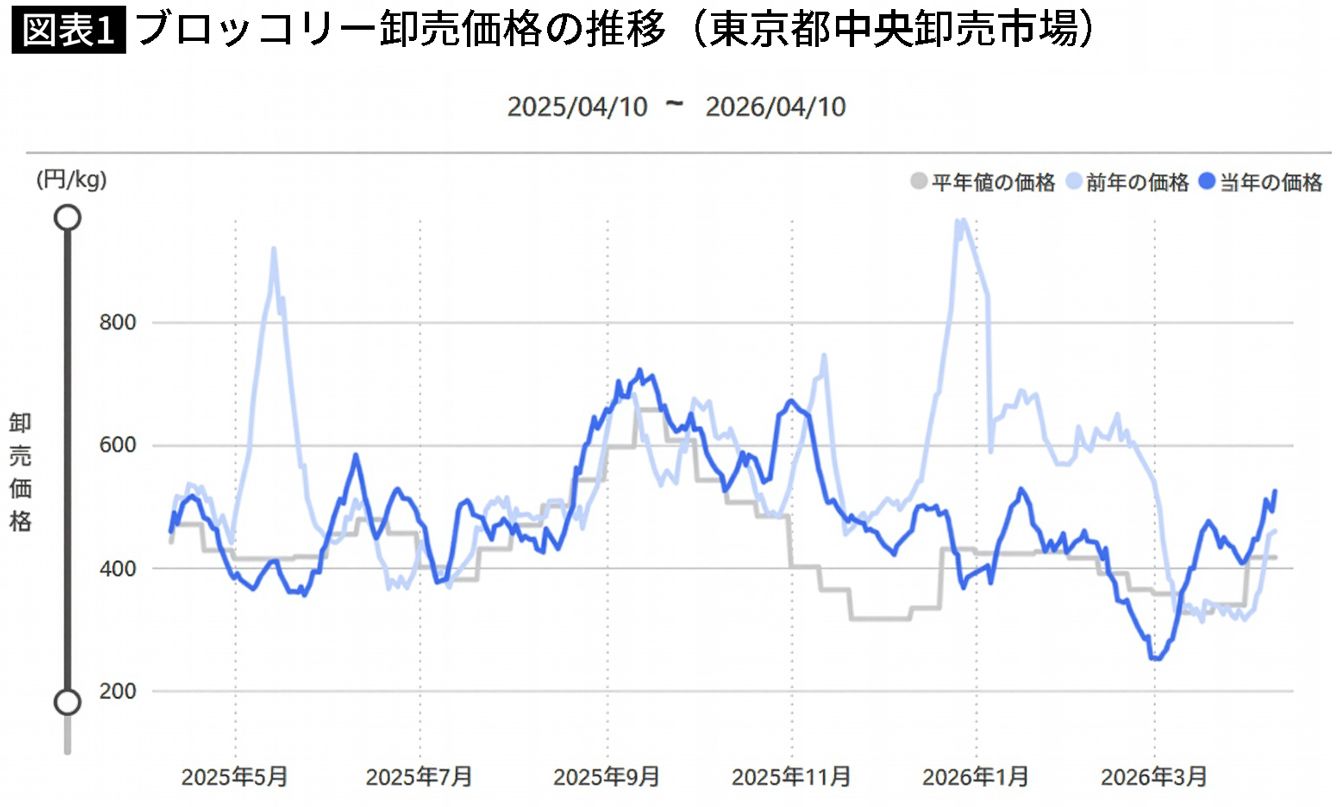 ブロッコリー1キロ(市場では20個入りで8キロとして計算)あたり価格:2025年4月10日~2026年4月10日までの相場(農林水産省HPより)