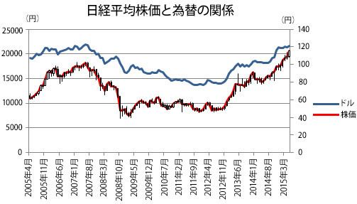 日経平均株価とドルの為替レートとは、正の相関を描く。