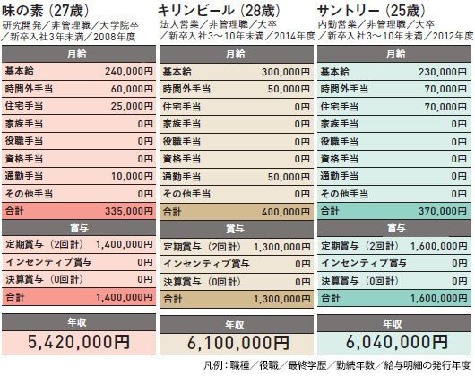 企業別年収:味の素(27歳)/キリンビール(28歳)/サントリー(25歳)