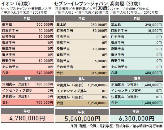 企業別年収:イオン(40歳)/セブン.イレブン・ジャパン(30歳)/髙島屋(33歳)