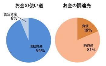 貸借対照表の個々の科目について細かく見るのではなく、まずは円グラフから全体像を掴む。