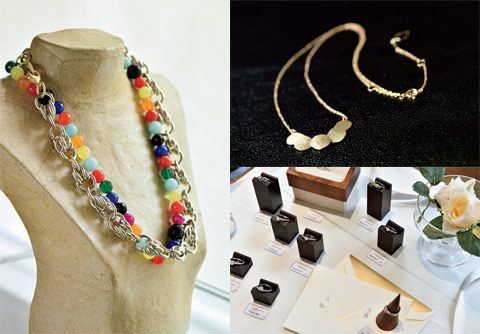 【写真左】素材はオニキスやアゲートのカラフルなネックレス。2万8000円(税抜)【写真右上】5枚の葉を重ねたイメージで作られたゴールドネックレス。9万円(税抜)【写真右下】ブライダルコレクションも豊富に揃う。