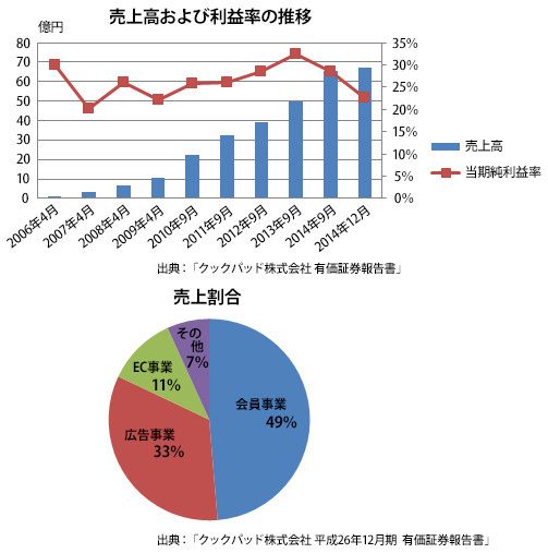 【上】「売上高および利益率の推移」、【下】「売上割合」(編集部にて作図)。利益率はビジネスモデルによって異なるが、一般的に純利益率は小売業において数%程度、IT業は10%以上と言われる。クックパッドの利益率がいかに際だったものかが分かる。利益率については、連載第3回「利益率から企業の『景色』を見る!─売上や利益より重視すべき理由」にて詳しく述べている(