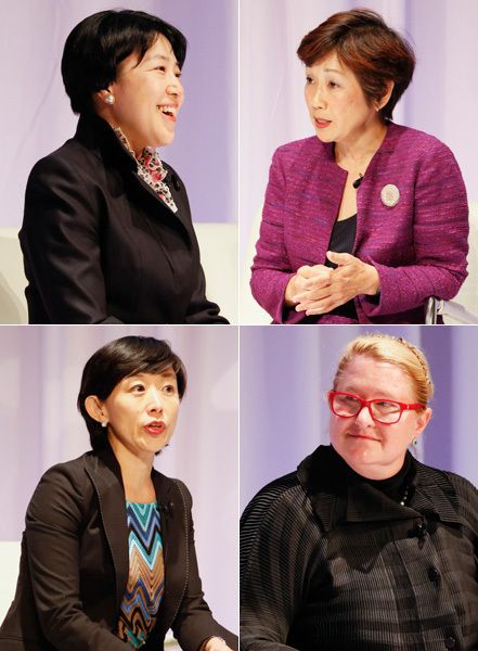 写真は左上から時計回りに、伊藤忠商事の茅野みつる執行役員、ANAホールディングスの小林いずみ社外取締役、在日米国商工会議所のジェイ・ポナゼッキ会頭、モデレーターを務めたNHK報道局経済部の飯田香織副部長。