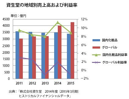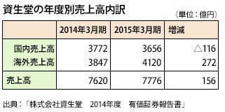 2015年3月期の有価証券報告書によれば、増収増益の資生堂。しかし、売上高の内訳を見ると……(編集部にて作表)。