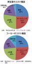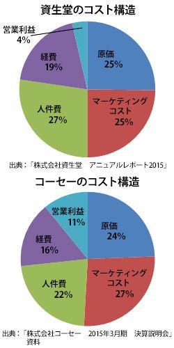 【上】資生堂のコスト構造(経費には研究開発費を含む)、【下】コーセーのコスト構造(経費には運賃荷造費、減価償却費、研究開発費、その他を含む)(図はともに編集部にて作図、小数点以下四捨五入)。同業種でコスト構造を比較することにより、特徴をつかむことができる。