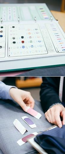 【写真上】ボタンの色や種類だけでなく、ボタンホールのかがり糸の色も選べる。近年、既製品でボタンホールに目立つ色糸を使ったものが見られるようになったが、上品に仕上げたい場合は、目立たない色糸を選ぶ方がよい。【写真下】裏地は色も柄も豊富。小さい裏地のサンプルを、表地の上において仕上がりのイメージを確認していく。