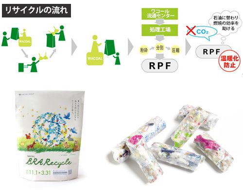 【上】キャンペーン実施店舗で配布されるブラ・リサイクルバッグに、不要なブラジャーを入れて、店舗に持って行く。回収されたバッグは、ワコール流通センターから処理工場に送られ、RPFという燃料にリサイクルされる。キャンペーン実施店舗については、webサイトで確認できる。(