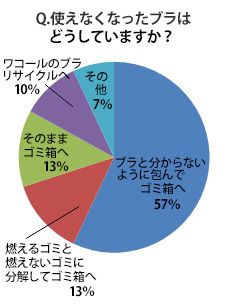 ブラジャーの処分方法に困っている人は多い。ワコールが実施したアンケートには「切り刻むのは心苦しいので、紙袋などに入れて捨てています」「ワイヤー部分や金具など燃えないゴミと、燃えるゴミとに細かく分けて、布の部分はハサミで切り刻んでから捨てています」「いつもどうやって捨てたらいいのか悩んでしまいますが、結局ほかの燃えるごみと一緒に混ぜてしまいます」などの声が寄せられた。(出典:ワコール「ブラパン」、集計期間 2013年1月1日から1月31日まで。総計 4440人、MyWacoalアンケート)