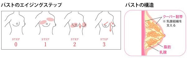 【左】バストのエイジングが進むステップを示した図。ステップ1の上胸がそげて、デコルテのボリュームが落ちる段階で、加齢による変化に気付く人が多いとのこと。【右】バストの構造。(画像提供 ワコール)