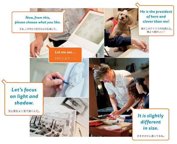 【写真左上から時計回りに】教材は、ゴッホやピカソも学んだというシャルル・バルグの教本。/デッサンをのぞきにきた先生の相棒ロミオ。人懐っこくて芸達者。/わずかな差も見逃さないクレッグ・チヴァース先生。さすがです!/レッスン1年目の生徒さん(80代女性)が描いたという風景画。