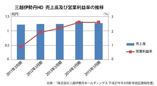 三越伊勢丹ホールディングス 売上高および営業利益率の推移。