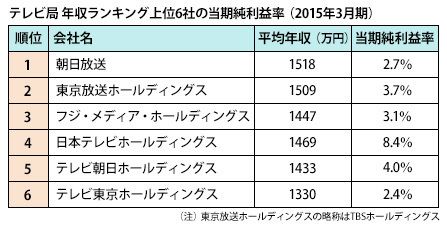 テレビ局 年収ランキング上位6社の当期純利益率