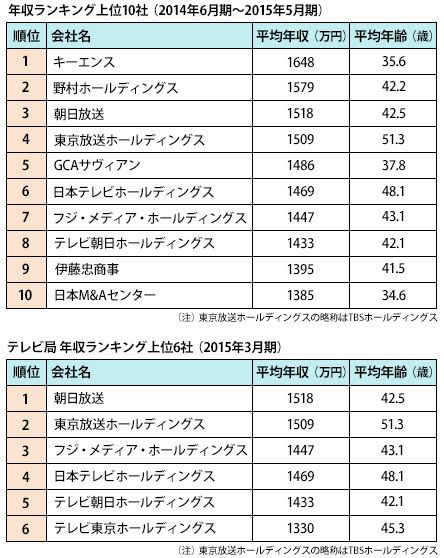 【上】年収ランキング上位10社。その半数をテレビ局が占める。【下】テレビ局 年収ランキング上位6社。いずれも年収1300万円を超える。
