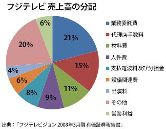 フジテレビ 売上高の分配。最も多くを占めるのは、原価及び販管費に計上されている業務委託費の21%。いかに社外のリソースが多く使われているかが分かる。