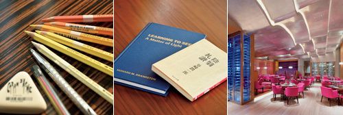 【写真左】美しく機能的な文房具に惹かれる。デザイン画を描くさいに使用する光を感じさせるイエローとオレンジの色鉛筆など。【写真中】光にまつわる名著2冊はバイブル。【写真右】東京アメリカンクラブ内レストラン「CHOP Steak house」。(C)Jeff Goldberg/Esto