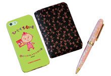 名刺ケースは印傳屋のものを愛用。カルビーの商品と自分の名前が入ったスマホカバーは目を引く。