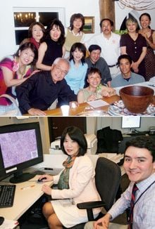 【写真上】ピッツバーグ大学に勤務していた頃。職場の人たちと。【写真下】病理標本を見ているところ。白衣ではなくスーツで研究する。