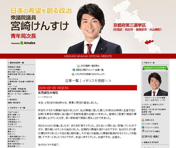 妻・金子恵美議員が出産したその日、宮崎氏はブログに出産のようすを事細かにつづり、「これから2人で大切に育てていきたいと思います」と宣言していた。