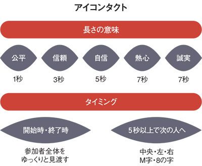 アイコンタクトでは、目が合う秒数に応じて、聞き手に与えるの印象が変わる。視線を配るタイミングも大切な要素だ。