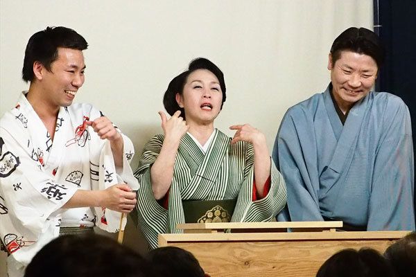 東京・神保町「らくごカフェ」で行われたイベント「笑福亭べ瓶+桂三度ふたり会 べべサンド」。桂三度さん(右)は落語家に転身する前、テレビ番組の構成作家や、芸人「世界のナベアツ」として活躍していた。この日のゲストは女道楽・内海英華さん(中)。客席からの質問を3人が受け付けるトークタイムは大いに盛り上がっていた。
