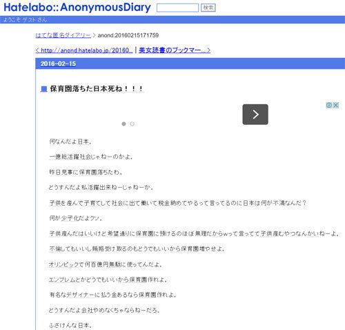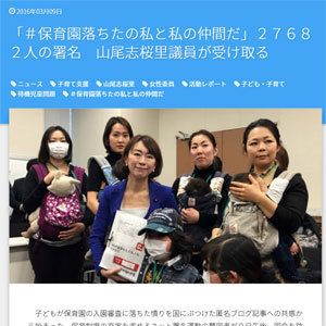 匿名ブログを書いた本人はTwitterで名乗りを上げた。アカウント名は「保育園落ちた人」(左)。ネット署名プラットフォームの「Change.org」では「保育園落ちたの私と私の仲間たちだ」と題した署名運動が起き、2万8000人以上の署名が集まった(右)