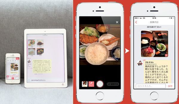 iOS/Android向けアプリ「やせる食事記録― ダイエット とるだけ」日々の栄養管理はスマホのアプリで。食事をアップすれば、管理栄養士が助言してくれる。【スマホ左】食事の写真を撮り、専用のアプリにアップする。【スマホ右】管理栄養士が食材をチェック。栄養バランスのアドバイスが届く。