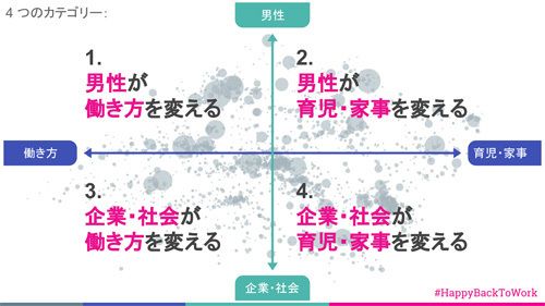 #HappyBackToWorkに寄せられたアイデアを、4つのカテゴリーに分類した。縦軸の“誰ができるアクションか”については、男性にアクションを起こして欲しいという傾向が見られた。横軸の “何を変えられるか”については、働き方の改革だけではなく、子育て中の社員に対して、その心理的・物理的不安を下げるために企業に何ができるかという観点からのアイデアが多数寄せられた。