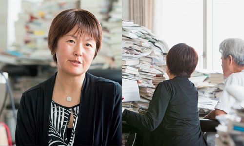 【写真左】田原総一朗事務所・江川綾子さん/田原総一朗さんの次女。大手広告代理店に4年ほど勤務し、1993年より現職。普段は事務所に常駐し、出演オファーの受け付けやスケジュールの調整、贈答記録などのデスク業務をこなす。【写真右】田原氏の原稿の締め切りを随時チェック。進み具合を確かめるのも大切な仕事。