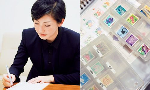 【写真左】三越伊勢丹ホールディングス 秘書室 秘書担当 浅野真由美さん/1995年、三越入社。日本橋本店の店内案内などに従事。入社3年目に自主的に秘書資格を取得し、本店長の秘書担当となる。その後、お得意様サロン担当を経て、2012年から大西洋社長の専任秘書となる。【写真右】切手は値段ごとに複数の種類をストックしている。記念切手なども。
