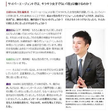 日経DUALに掲載されたサイバーエージェント 代表取締役 藤田晋さんへのインタビュー記事。同社の出世ママ代表、独身若手女性社員代表も登場し、華やかなものとなった。