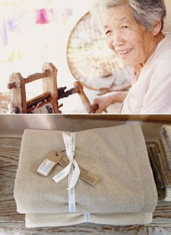 写真上/糸紡ぎや手織りの現場は、女性によって支えられている。伝統手技の継承を目指した後進指導もプラネッタ・オーガニカが担う役割の1つ。写真下/上質なコットンやヘンプを使用したリネン類は、タイのセレブレティからも愛される創業からの定番。