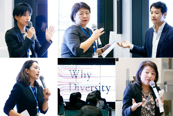 人物は左上から時計まわりに、中野円佳さん、梅田恵さん、入山章栄さん、大隅聖子さん、佐々木裕子さん。企業の人事、ダイバーシティ担当者が集まった会場は、2030に向けた各社の動向と有識者の知見を得ようと、熱気に包まれていた。