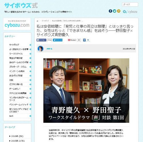 チーム・コラボレーションを支援するツールを開発・提供するサイボウズ・グループ。2014年に、ワーキングマザーの働き方をテーマにした動画を公開し話題となった。続く2015年末に公開された父親を主人公としたワークスタイルドラマ「声」(出演 田中圭、オダギリジョー 他)の視聴後に行われた衆議院議員の野田聖子さんとサイボウズ代表取締役社長の青野慶久さんによる対談では、共働きで子育てする夫婦を取り巻く環境や困難、そして喜びについて交わされた。