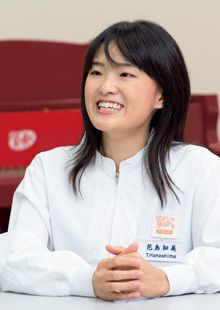 霞ヶ浦工場 無菌充填課 花島知美さん。院生時代、シリコンバレーに拠点を置く日米の企業を見学し「両方の強みを持つ最強の会社をつくりたい!」との思いで入社。「空気を読まず、思ったことを発言する。チームワークを固める秘訣です」